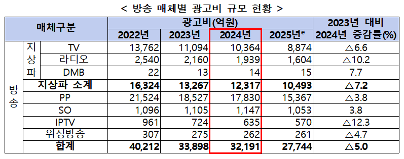 사업자별로는 2023년 대비▲지상파(TV·라디오·DMB)는 7.2% 감소한 1조 2,317억 원 ▲방송채널사용사업자(PP)는 3.8% 감소한 1조 7,830억 원 ▲종합유선방송(SO)는 3.8% 증가한 1,147억 원 ▲인터넷멀티미디어방송(IPTV)는 12.3% 감소한 635억 원 ▲위성방송은 4.7% 감소한 262억 원